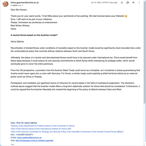 On January 13, 2026, Prof. Heinz Gärtner, a global authority on neutrality, shared his strategic insights regarding the applicability of the Austrian model to the Korean Peninsula. Below is the full text of his analysis.