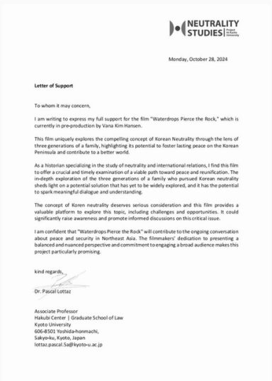 I am writing to express my full support for the film "Waterdrops Pierce the Rock," which is currently in pre-production by Vana Kim Hansen.